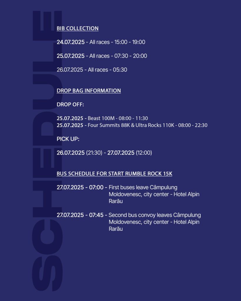 Drop bag pick up: from 26.07 21:00 to 27.07 12:00 Start/Finish line Platoul Central